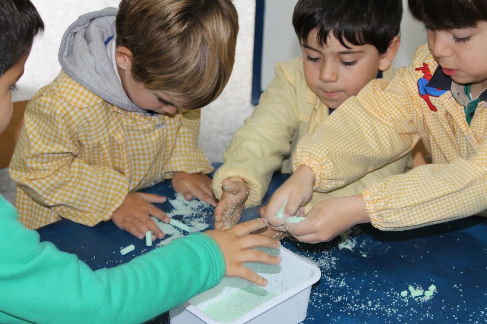 Luego se le proporcionó un montoncito de sal a cada niño/a y por grupos de cuatro o cinco fueron tiñendo la sal. De esta forma contaríamos con cinco o seis colores para poder configurar el tarrito.